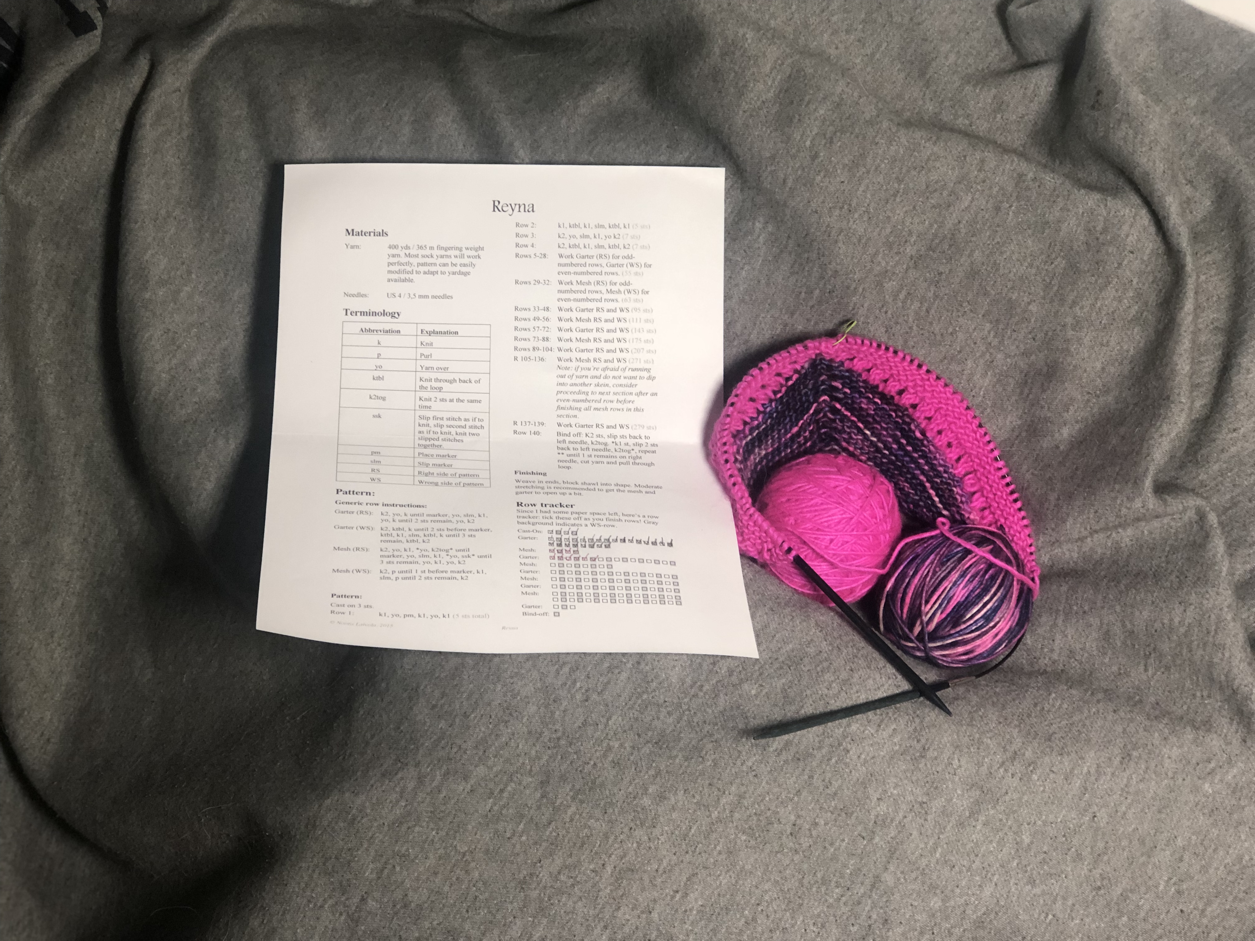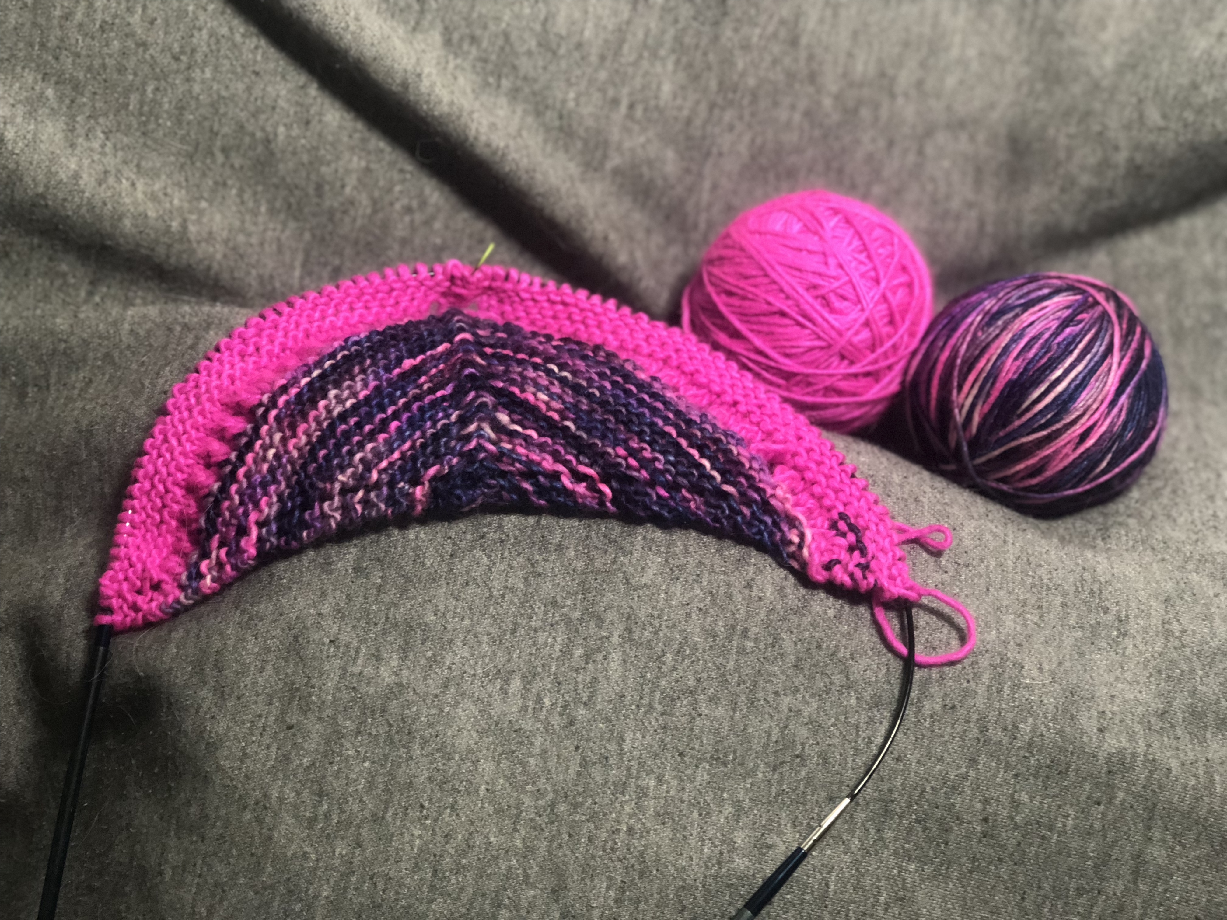 Started the Reyna shawl pattern by Noora Backlund; I particularly love the simple yarn-over spine running down the middle. Both yarns are Manos del Uruguay Silk Blend; solid pink is Shocking and multi is Fractal. All yarn and notions pictured are sourced with pride from my LYS.